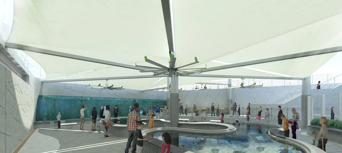 As part of a proposed renovation to the Moody Gardens Aquarium, we developed a small stingray exhibit just outside the gift shop, and main entrance. Designed as a sunken courtyard, a stretched fabric roof canopy and big-ass fans were the only method of shade and cooling provided. The walls pattern was an off-the-shelf form liner modified to include punched holes in the final wall installation inspired by constellations and mapping systems used for early exploration of the ocean.